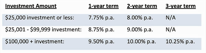 The Company is offering Notes with a maturity date of up to three years from the issuance date (the“Maturity Date”). If you invest less than $100,000.00 you may select a one-year or two- year term. If you invest$100,000.00 or more, you may select up to a three-year term.